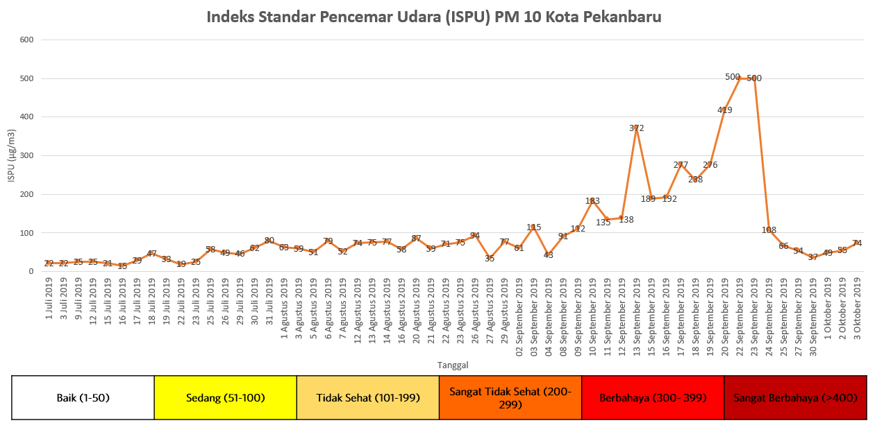 Sejak turun hujan, kualitas udara membaik. Data Indeks Standar Pencemar Udara (ISPU) PM10 menunjukan penurunan status kualitas udara dari sangat berbahaya menjadi tidak sehat hingga baik. Pekan pertama Oktober, kualitas udara sudah berada di level sedang dan sesekali pada level baik.