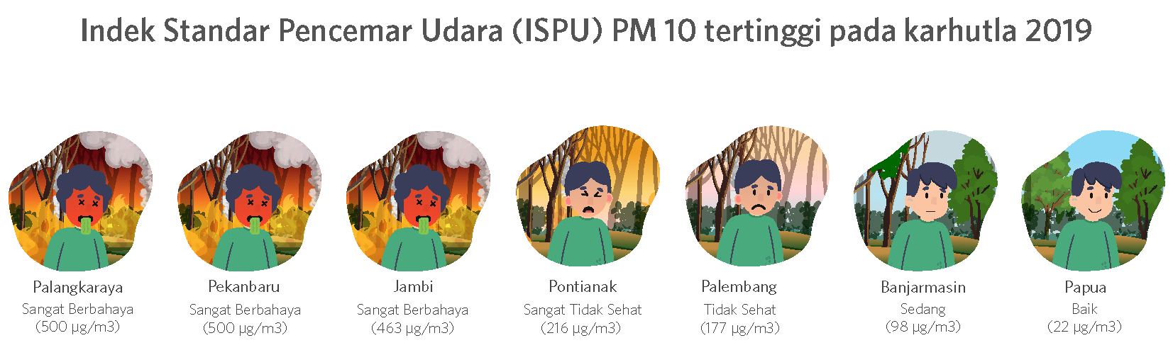 Dari arsip tersebut dapat kita lihat bahwa pada tahun 2019 tingkat pencemaran PM10 di Kota Pekanbaru, Jambi, dan Palangka Raya masuk dalam kategori “Sangat Berbahaya” (>400 μg/m3). Angka ini jauh melampaui ambang batas yang diperbolehkan pemerintah Indonesia ataupun WHO.