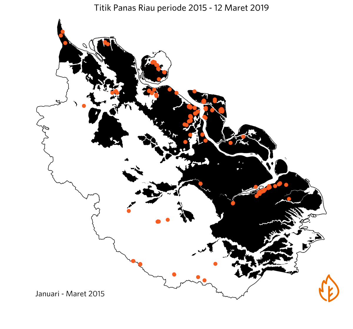 Di awal 2019, sejumlah kebakaran kembali terjadi di Provinsi Riau. Sebagian besar karhutla di wilayah ini sulit dipadamkan karena terjadi di lahan gambut. Analisis awal Pantau Gambut menunjukkan tren jumlah titik panas di Riau pada Januari-Maret 2019 ini sudah lebih tinggi dibandingkan periode yang sama pada 2015, ketika bencana kebakaran melanda Indonesia.