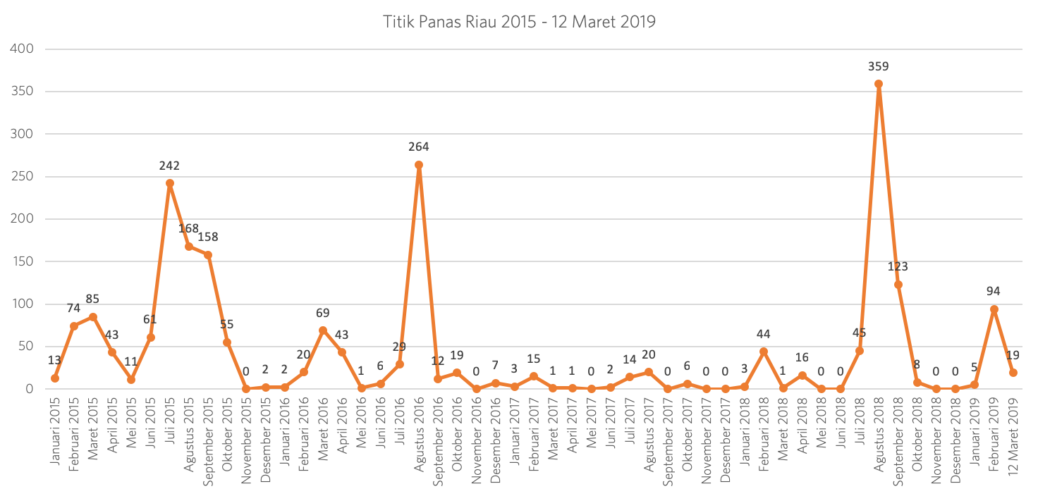Selama periode 2015 hingga awal 2019, jumlah kemunculan titik panas di wilayah Riau sempat menurun pada 2017. Namun, jumlah titik panas ini kembali melonjak pada Agustus 2018. Musim kemarau yang lebih kering dari tahun sebelumnya adalah penyebab kenaikan jumlah titik panas tersebut.