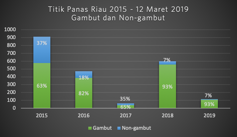 Pantau Gambut melakukan tumpang susun titik panas dengan peta gambut di Indonesia. Hasilnya, secara rata-rata 77% dari seluruh titik panas yang terpantau di wilayah Riau selama periode 2015 hingga 12 Maret 2019, terjadi di wilayah gambut. Rincian persentase kejadian titik panas di lahan gambut berdasarkan tahun dapat dilihat dalam grafik berikut.