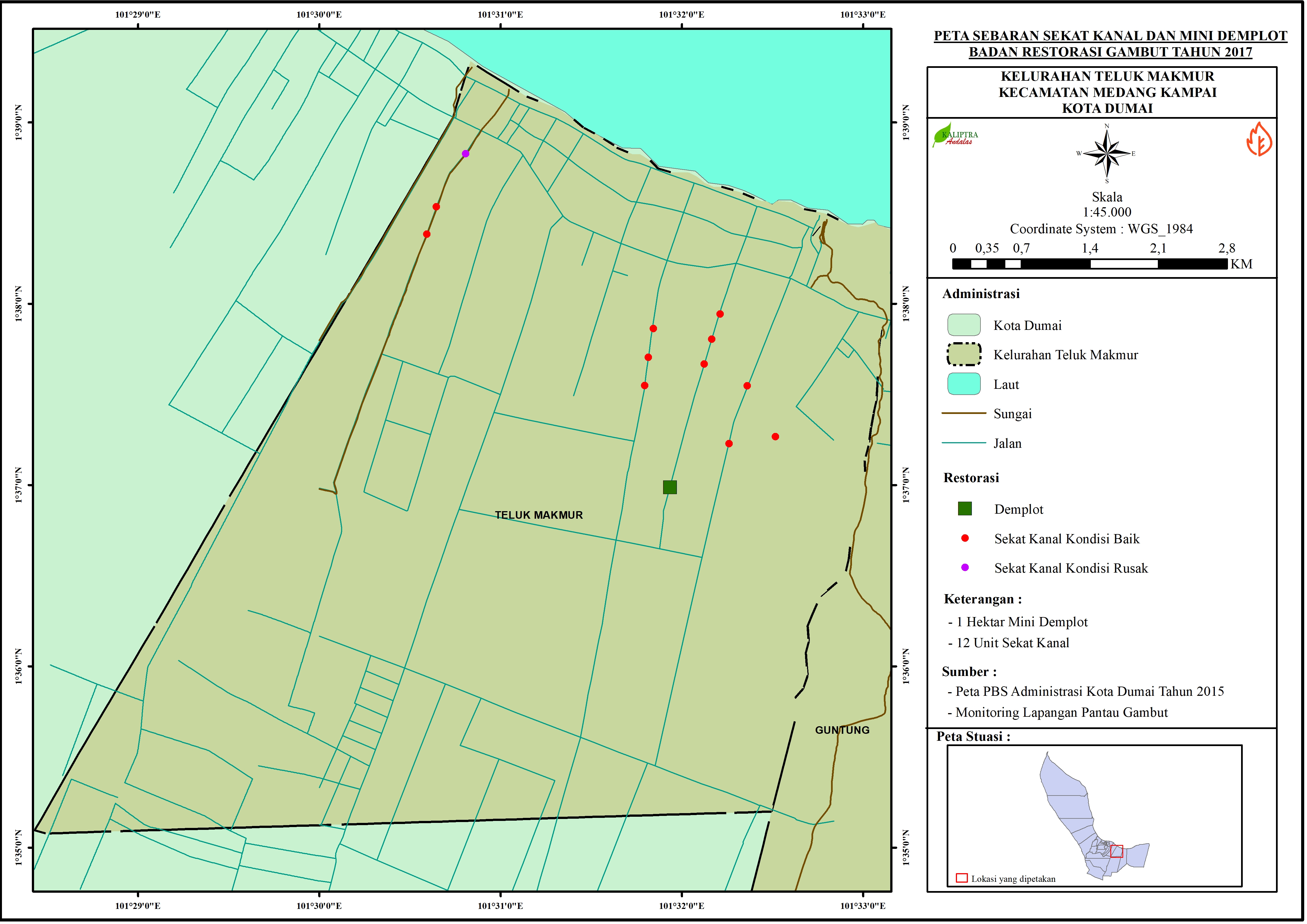 Oleh Almo PradanaKelurahan Teluk Makmur yang berada dalam wilayah administrasi Kecamatan Medang Kampai, Kabupaten Dumai, Provinsi Riau, merupakan salah satu lokasi prioritas dalam restorasi 2 juta hektar lahan gambut. Sejumlah kegiatan terkait restorasi telah dilakukan di wilayah ini. Namun, upaya restorasi masih jauh dari berhasil. Salah satu indikator yang ditemukan oleh tim adalah terjadinya kebakaran di dekat lokasi pembangunan infrastruktur pembasahan gambut.