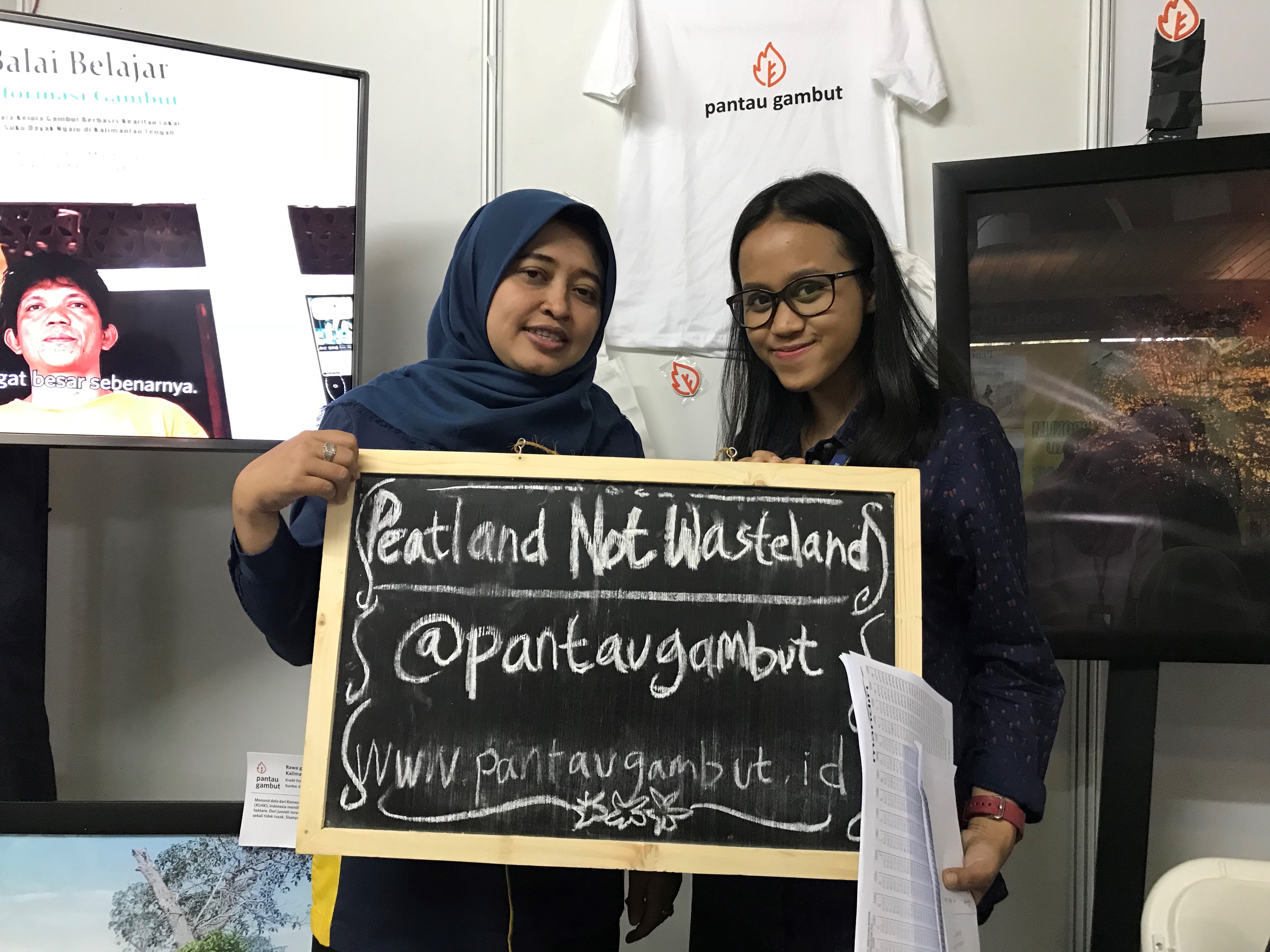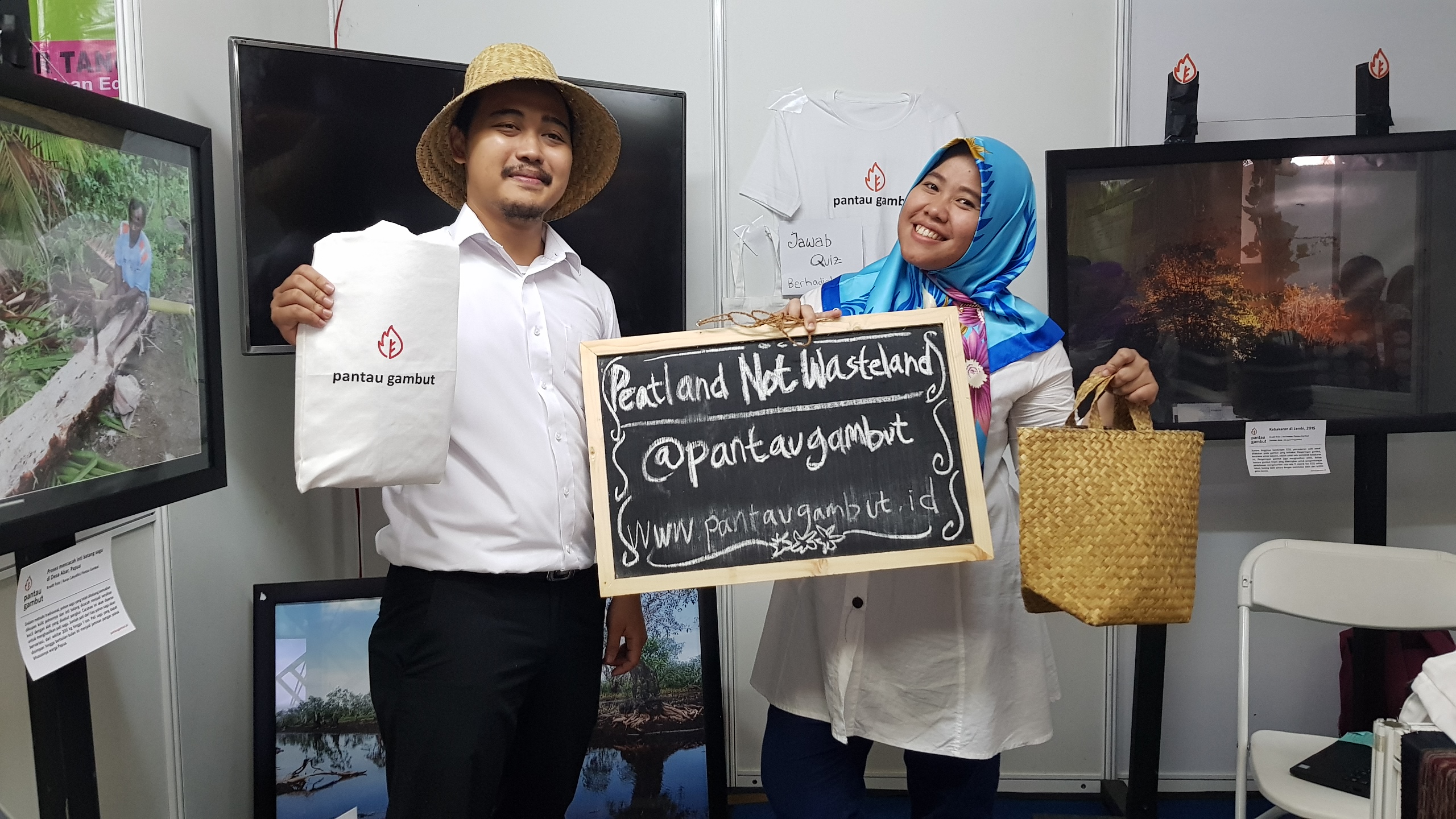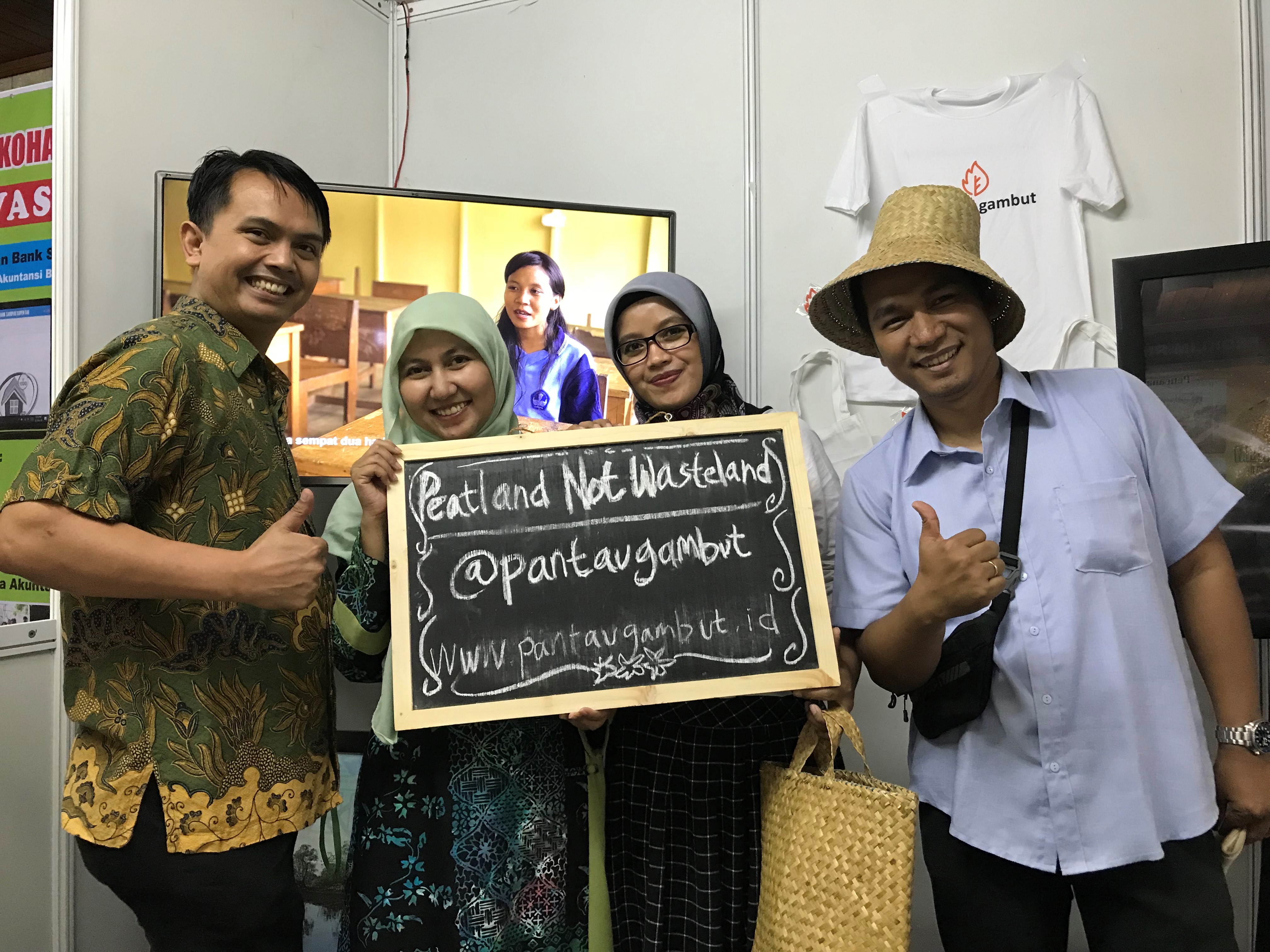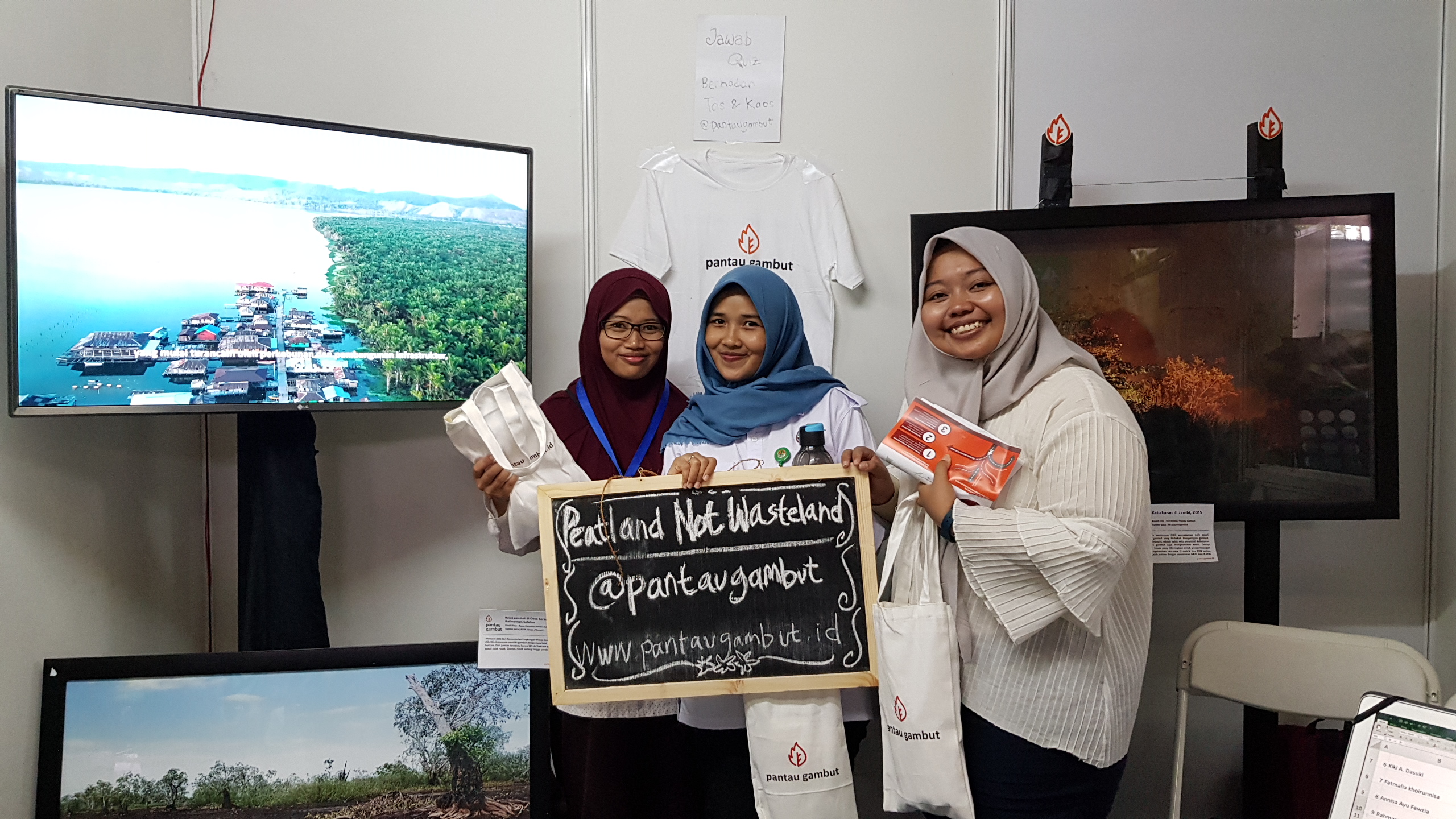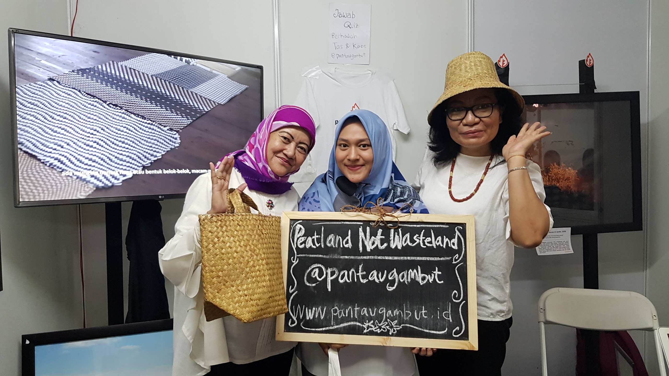 Pengunjung yang antusias ingin tahu lebih banyak tentang gambut meramaikan booth kami. Tidak lupa mereka juga berfoto sambil mengenakan topi dan tas yang terbuat dari Purun sambil memegang papan bertuliskan pesan agar tidak menganggap lahan gambut sebagai lahan yang tidak berguna, karena sesungguhnya begitu banyak potensi yang bisa dikelola dari hasil memanfaatkan lahan tersebut. Jaga terus gambut kita!