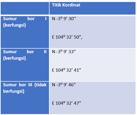 Penulis mengunjungi dua sumur bor yang masih berfungsi normal dan juga satu yang sudah rusak. Kedua sumur bor yang masih berfungsi berada persis di belakang perkantoran KRS dan di dalam kebun pembibitan.
